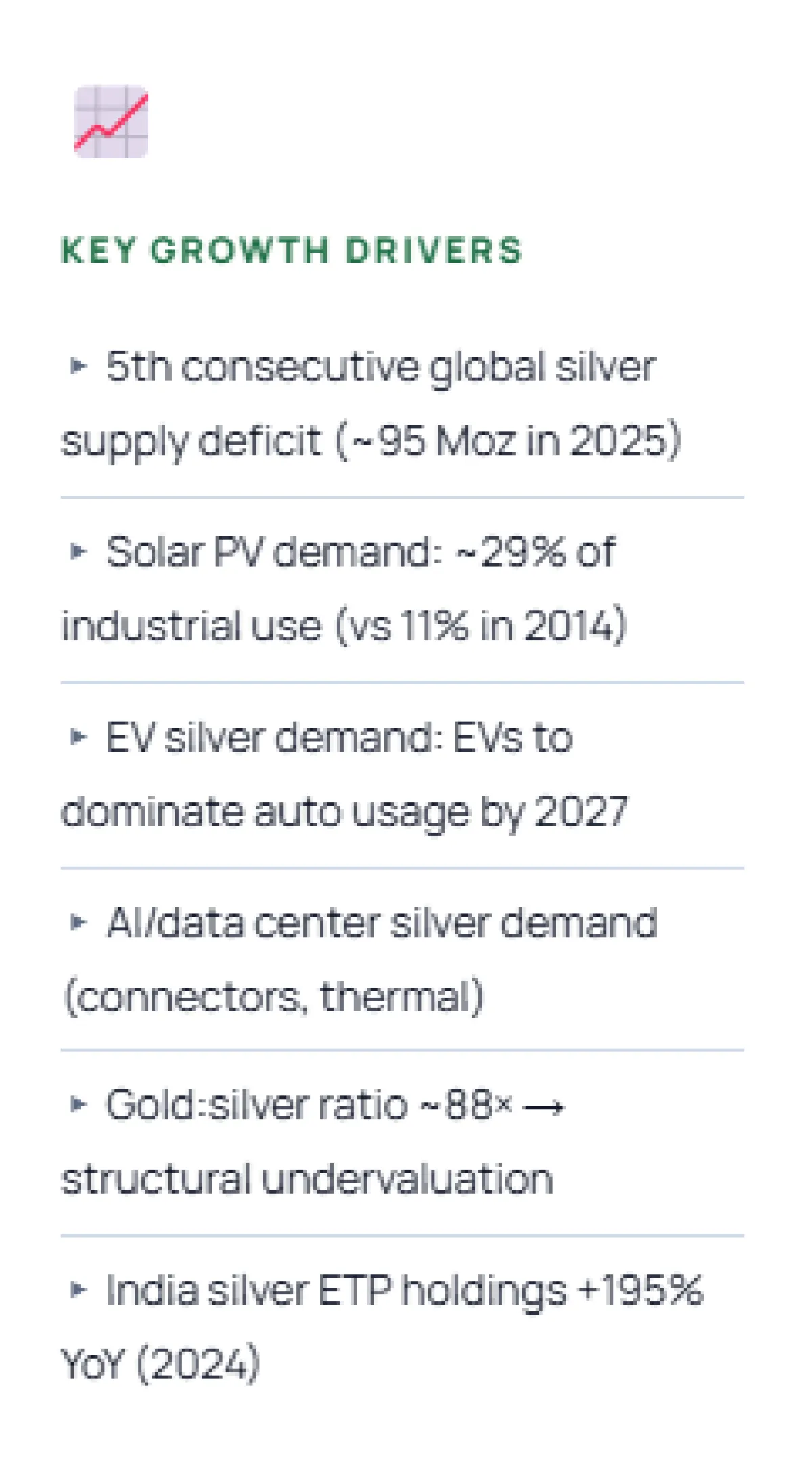 Precious Metal / Investment Silver (41.4% of demand): Silver functions as a monetary metal, historically traded at 1/67th the price of gold. At the current ratio of ~88×, silver is undervalued on this metric. As real interest rates decline and inflation expectations rise, investment demand for silver (ETPs, bars, coins) intensifies.