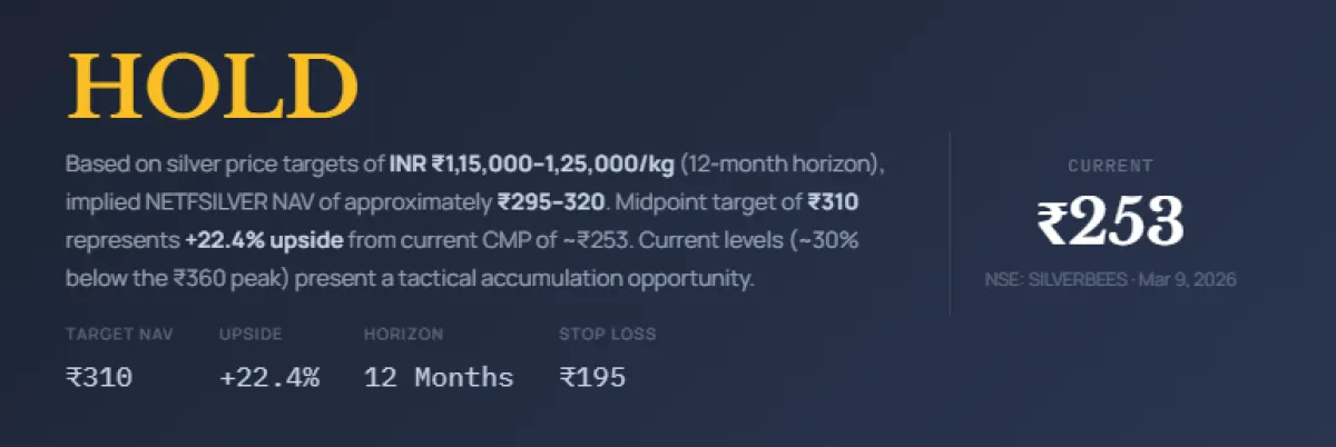 Rating: HOLD / Accumulate on Dips — The structural case for silver is intact, but after the extraordinary 2025 rally (+126% in FY25), the near-term path involves consolidation and digestion of gains. We rate NETFSILVER as HOLD for existing investors and Accumulate on Dips below ₹230 for new investors, with a 12-month NAV target of ₹310 (+22.4%). Silver's medium-term outlook remains bullish given structural supply deficits, but near-term volatility should be expected.