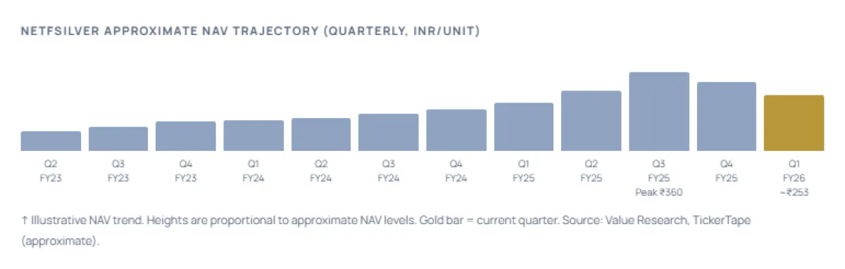 Trend Analysis: NETFSILVER delivered a +164.9% return in the year to February 2026, making it among the top-performing ETFs in India. The tracking error of 0.62% confirms the fund efficiently mirrors silver's domestic price with minimal slippage. The correction from ₹360 (Oct 2025 peak) to ~₹253 currently represents a ~30% pullback from peak — consistent with silver's historically high volatility.